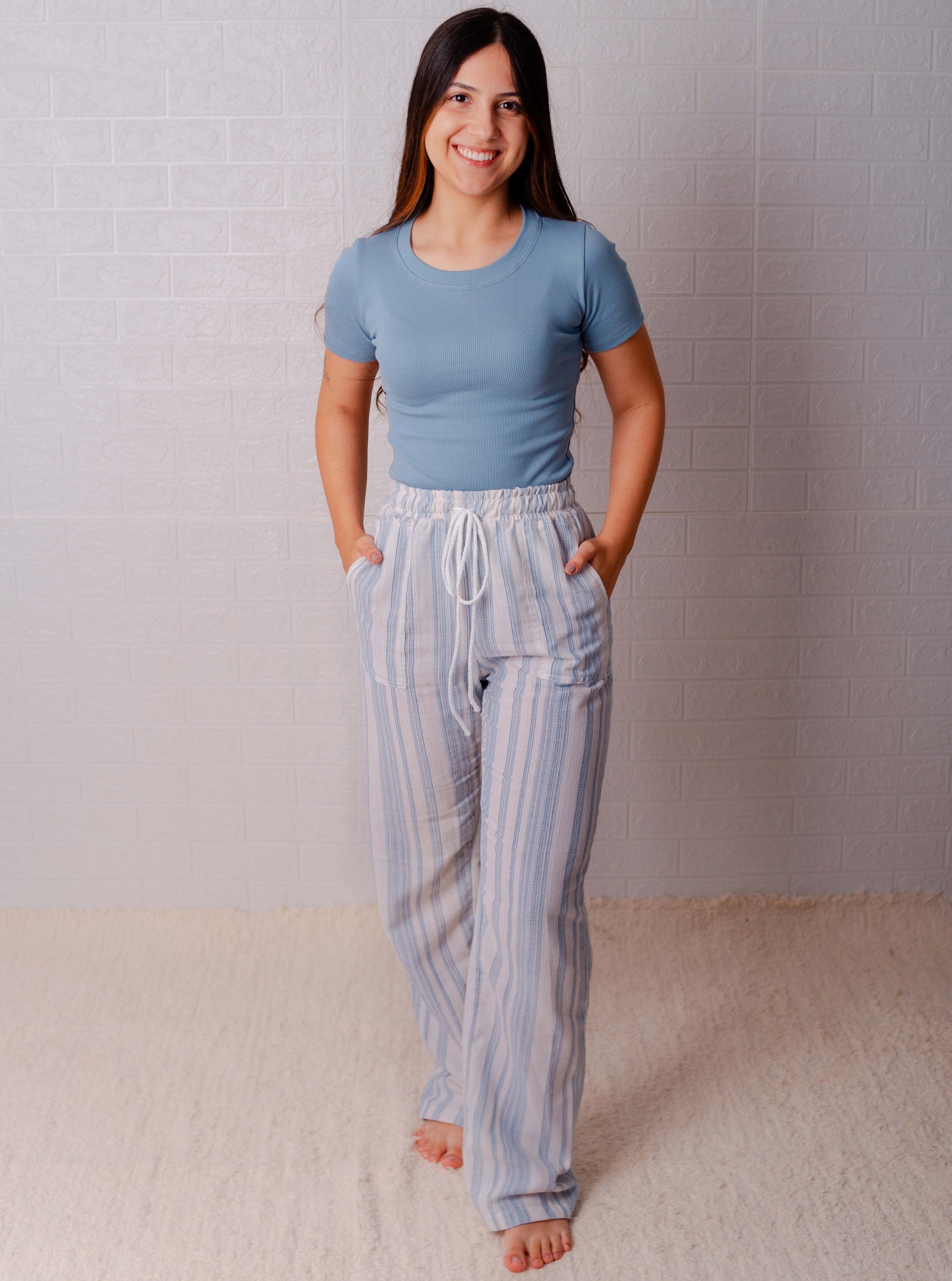 Calça listrada com bolsos na parte da frente e costas,com elástico na cintura e corda para amarrar ,em poliéster (textura idêntica à gaze de algodão)