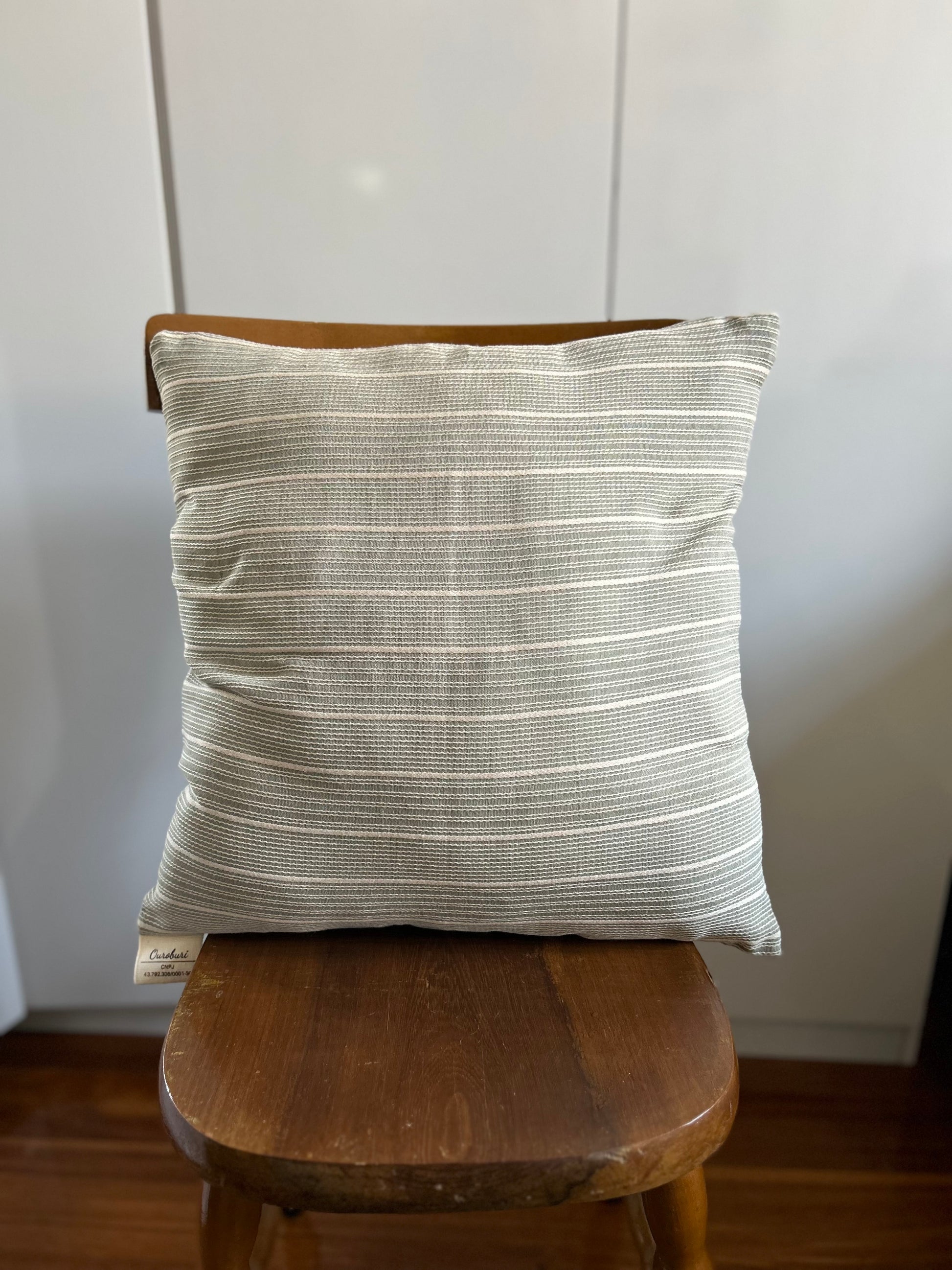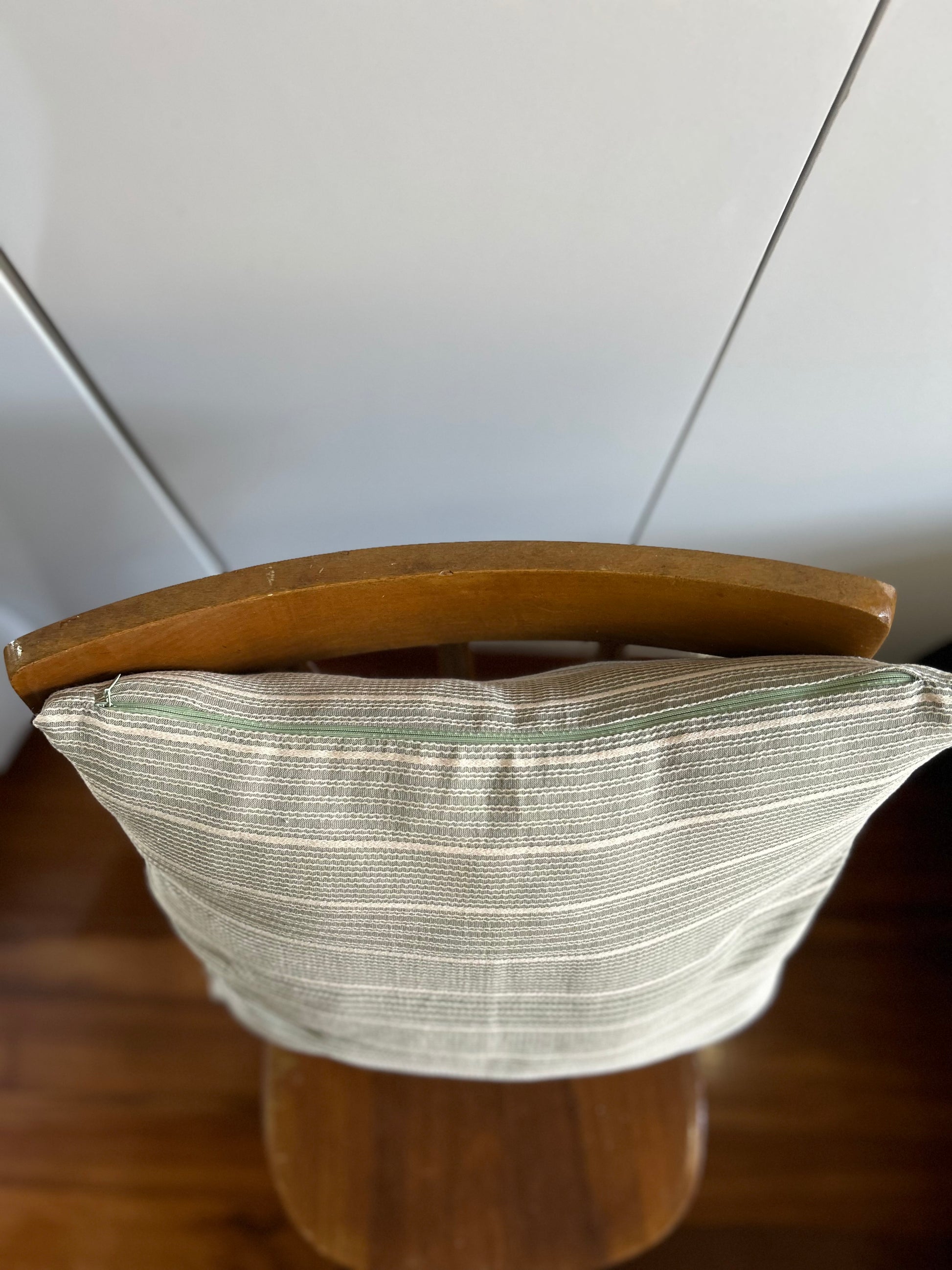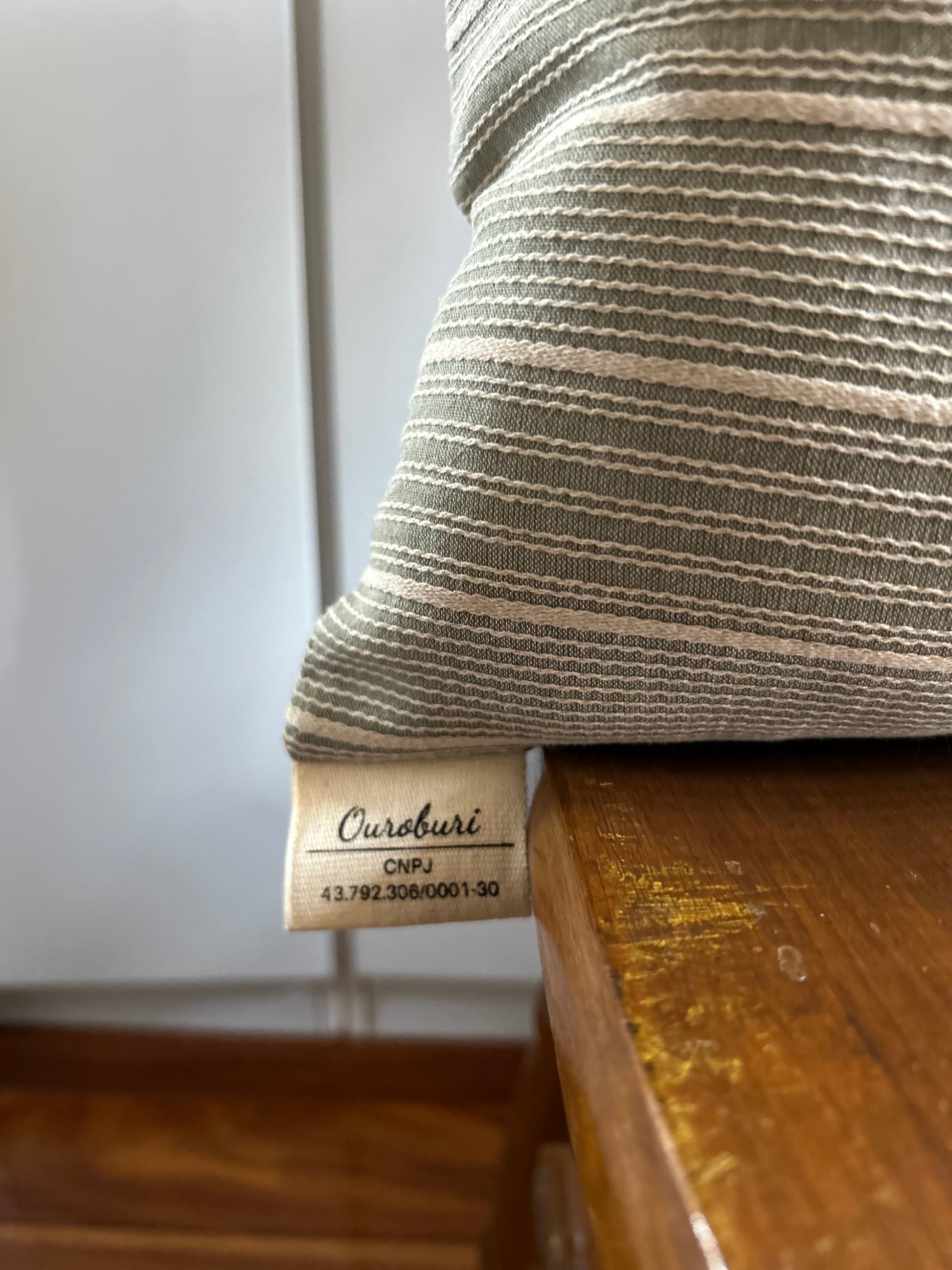capa em tecido de algodão texturizado verde com listras em tom cru com fechamento em zíper invisível